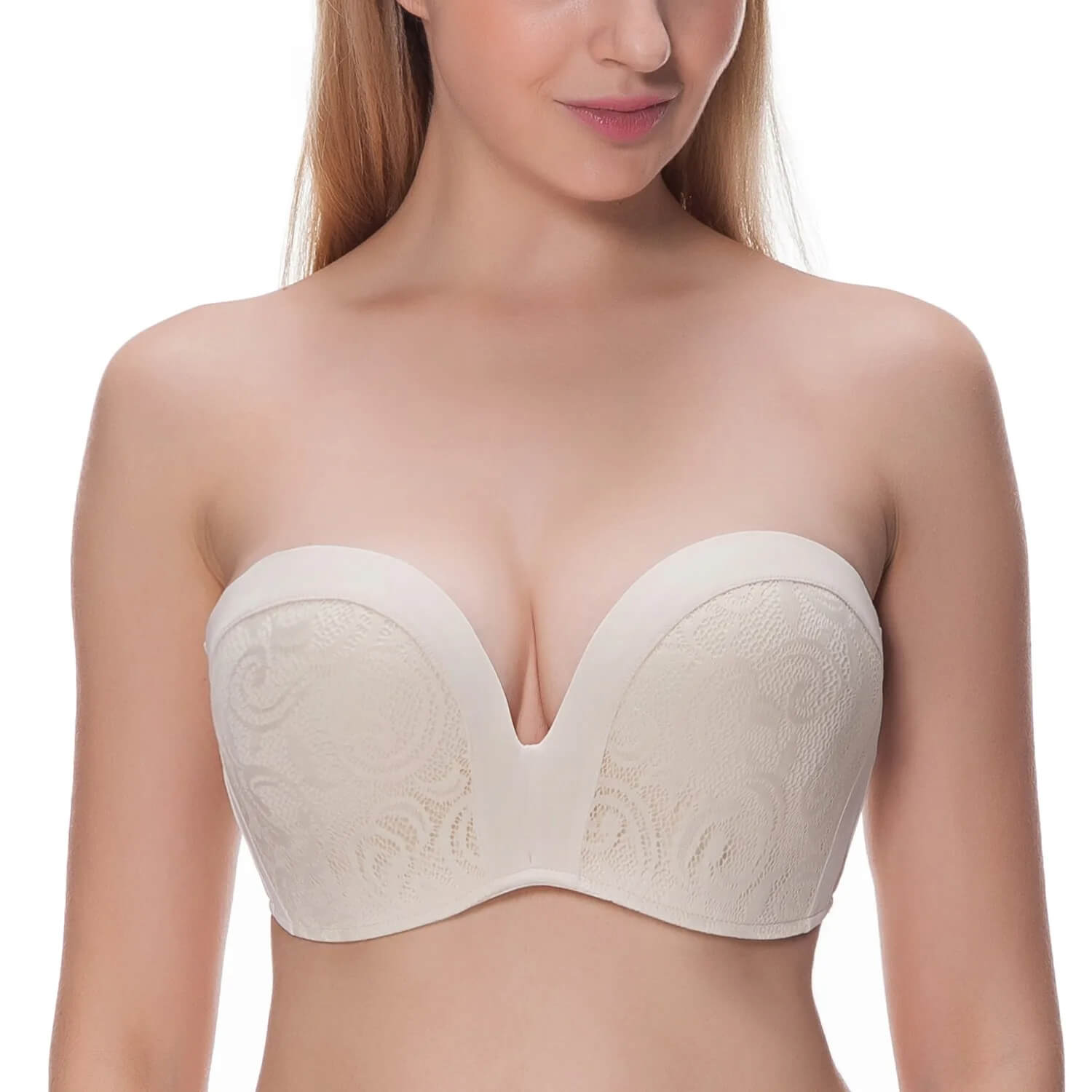 This strapless bra is specially designed for big breasts of C, D, DD, E, F cup size, underwire and padded cups design combined with lace decoration will perfect shape your breast to a good figure and make you look beautiful and elegant once you put it on.